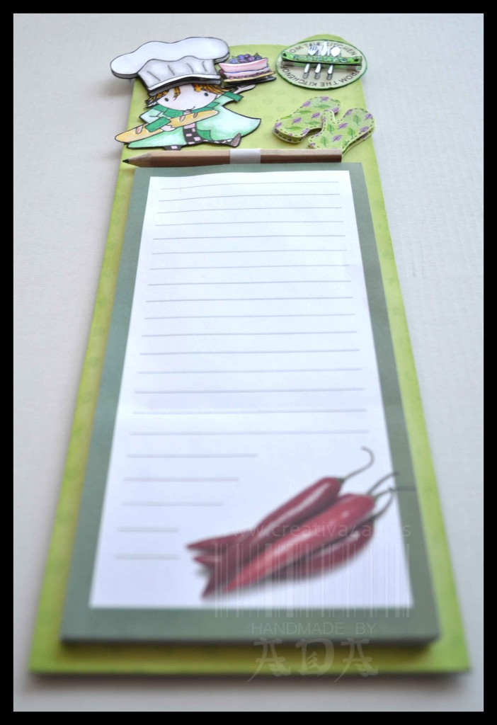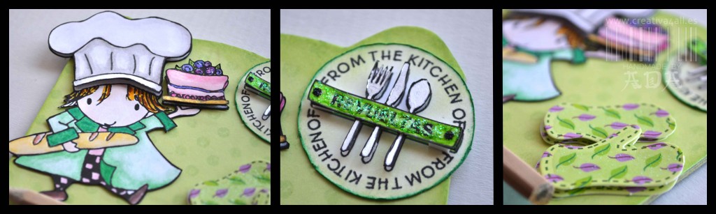 La capa del fondo del papel verde de topitos es de K&Company, los bordes están entintados con tinta verde lima de Aladine. La muñequita chef, está coloreada con acuarelas, y he puesto doble con almohadillas 3d el gorro y la tarta, la barra de pan y la tarta tienen Glossy Accents para darle efecto de volumen.