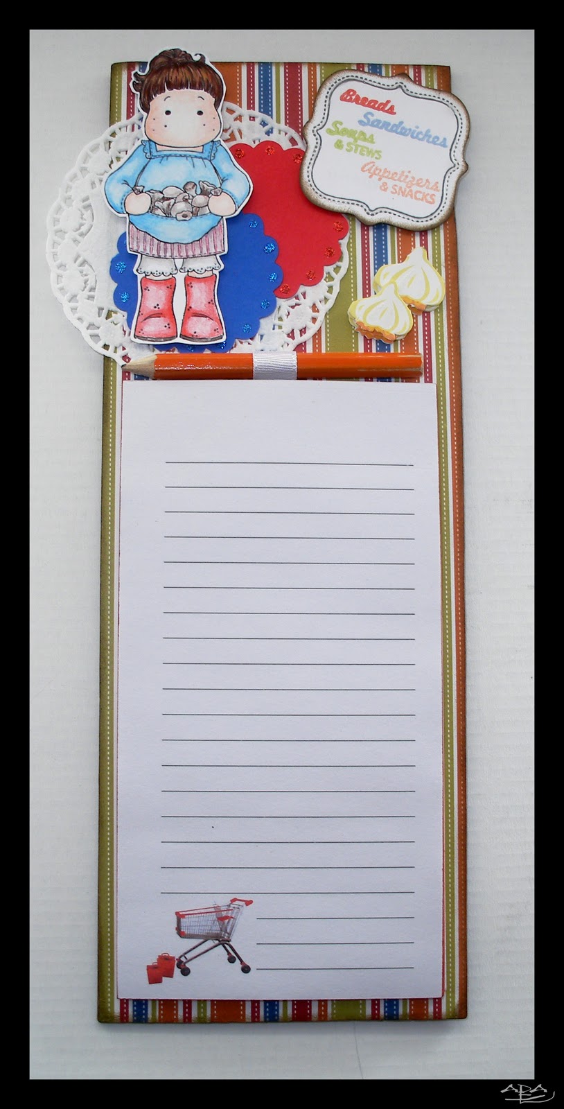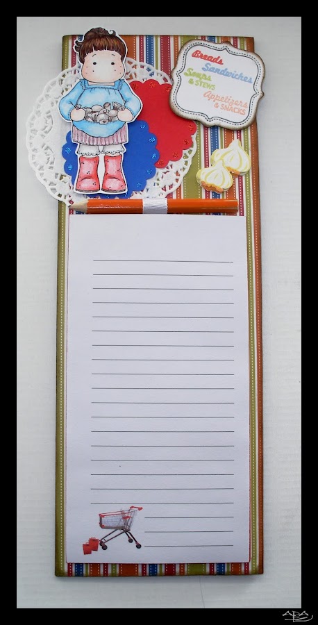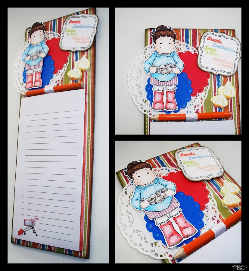 El cartel del menú está estampado con tinta negra Color Box con un sello de Fiskars de la colección Special Delivery, y los nombres del "menú" estampados en varios colores con tintas Aladine y sellos también de Fiskars de la colección Recipe Madness. En el borde del marco tiene un toque de Glossy Accents. El borde está también entintado con Distress Walnut Stain.