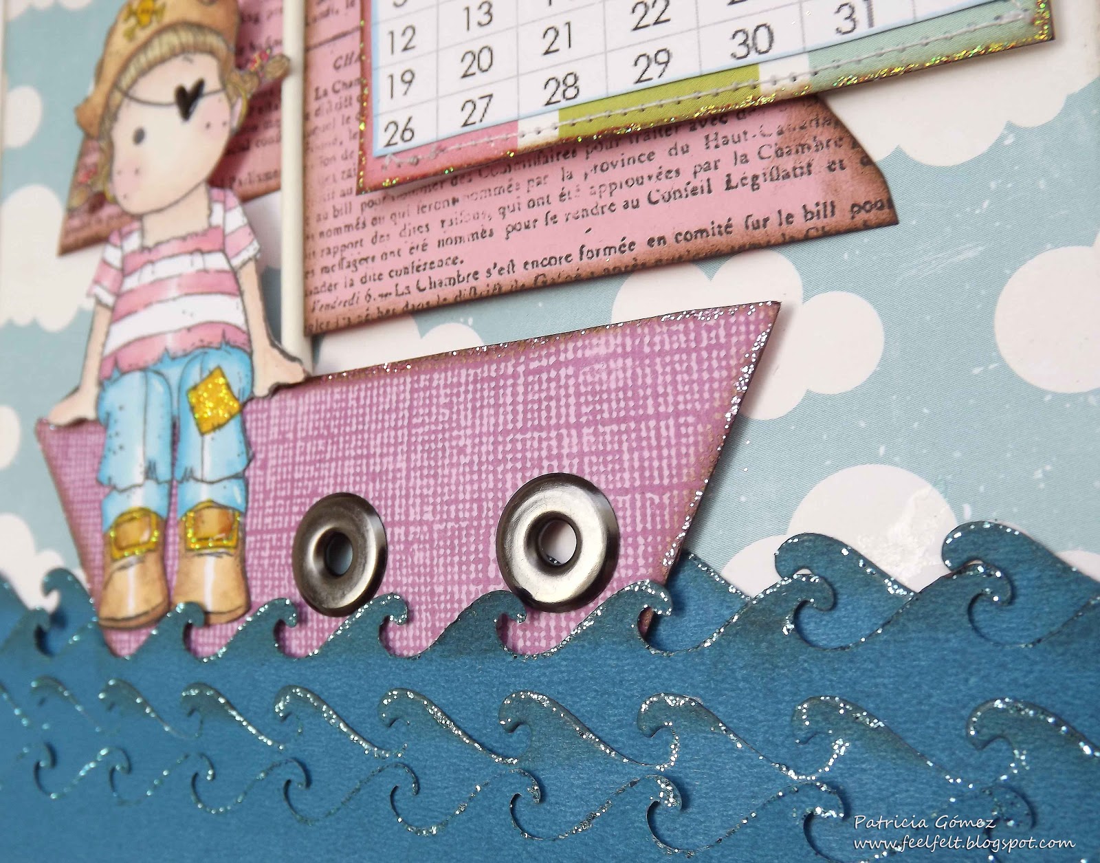 Para el mes de Julio, colores cálidos, con Magnolia Roller Tilda como protagonista, vestida con paper piecing, y coloreada con promarkers.