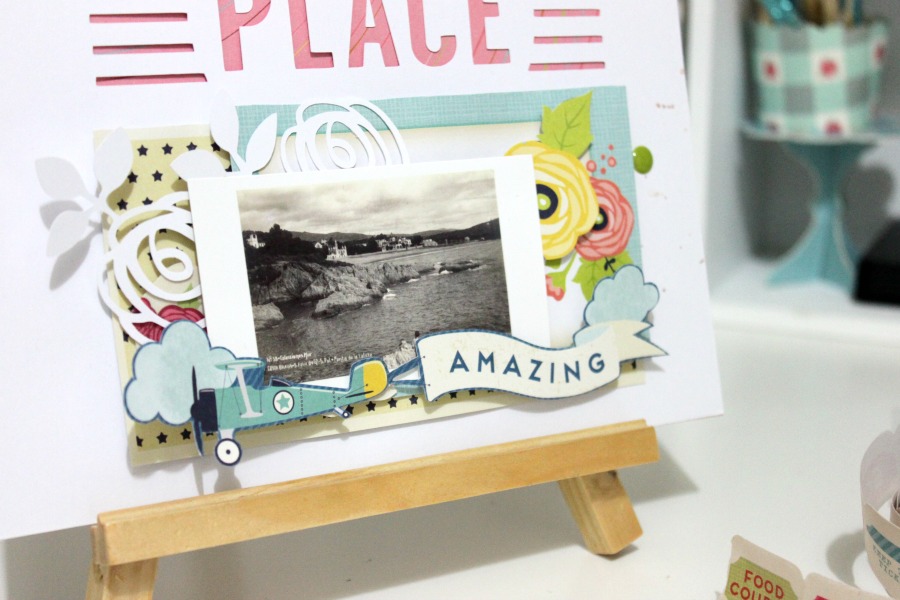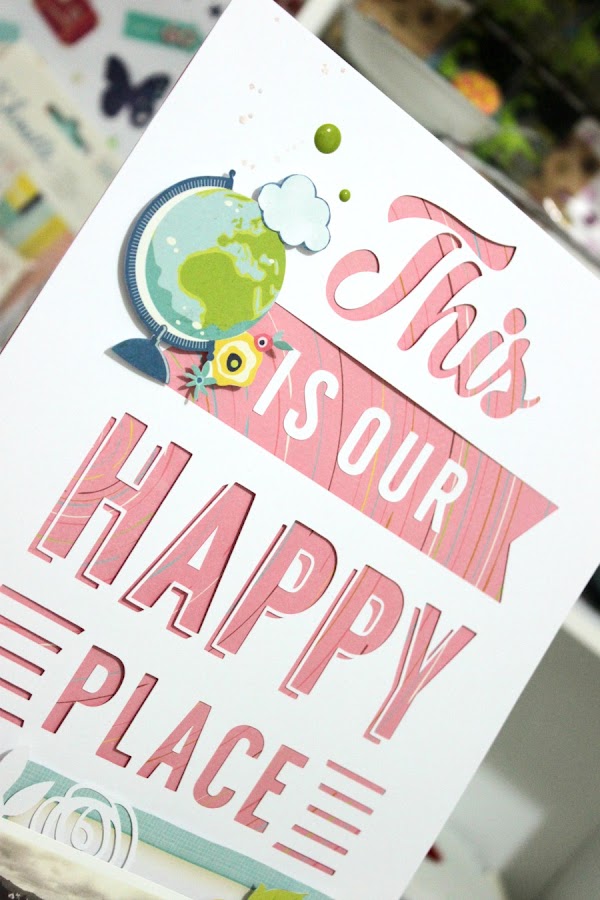 En una cartulina tamaño folio de color blanco hice un recorte con la Cameo, detrás un papelito de la colección Star Shine de Shimelle, la cual podéis encontrar en 512 Ideas, la foto pequeñita y centrada abajo, resaltado por un montón de adornos de la misma colección.