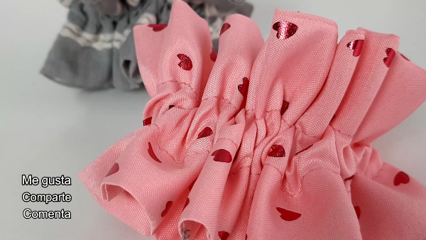 Ahora metemos la goma elástica y le hacemos un nudo. Escondemos el nudo dentro de la tela y para cerrarla, solapamos un borde con el otro y pasamos una costura.