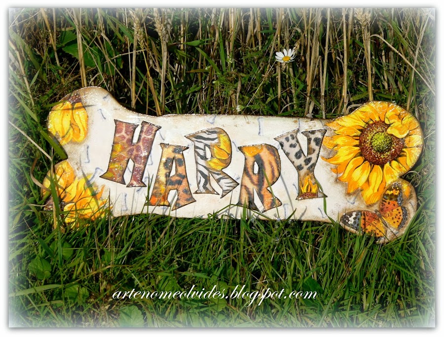 Mi mami montaba una casita para el, que se esconde ahi en el verano (como que el tiene que estar fuera con nosotros). Para mi era buen motivo para usar mi sierra:) y hacerle un hueso con su nombre.
