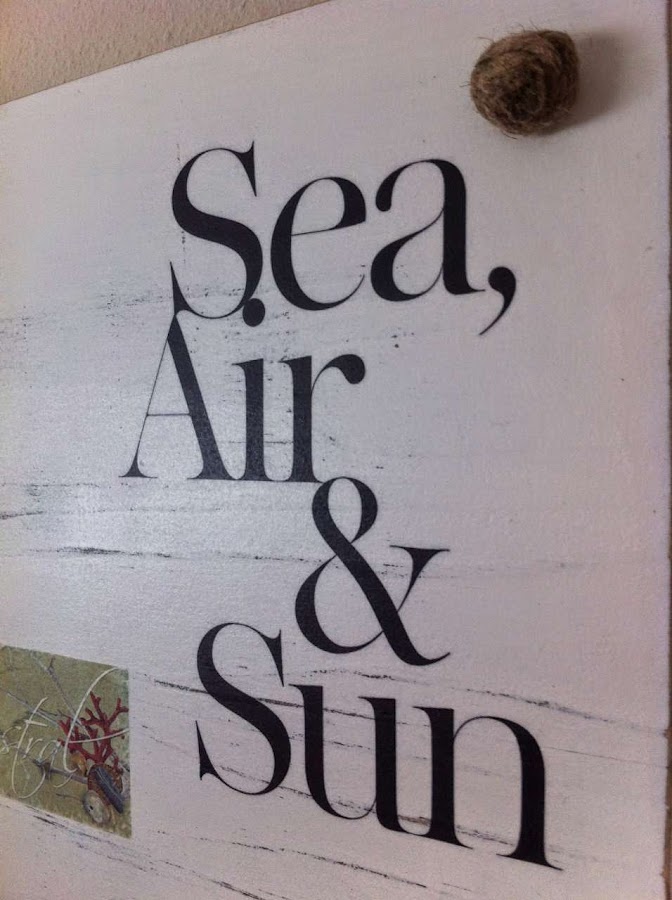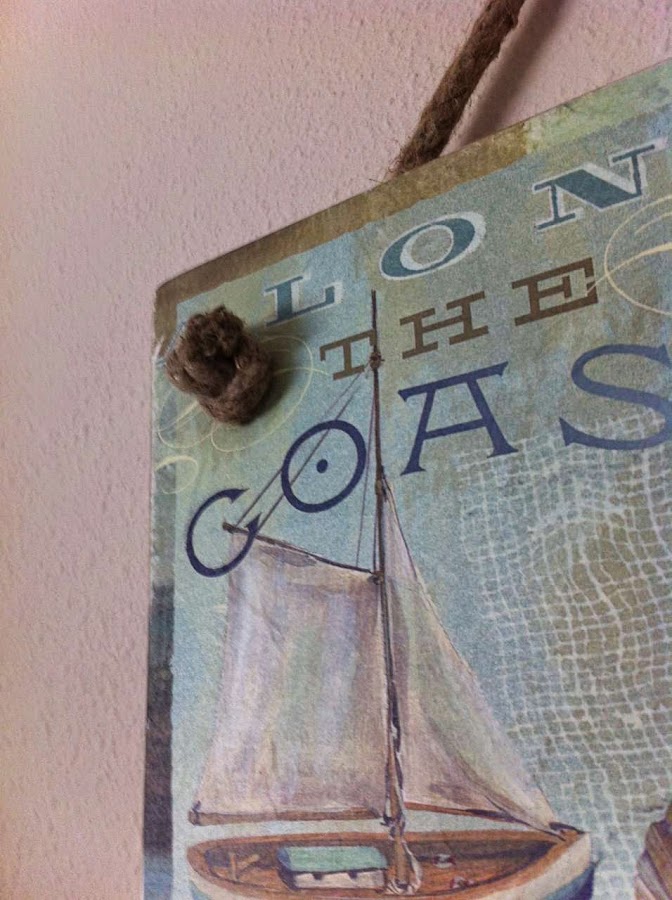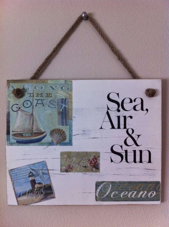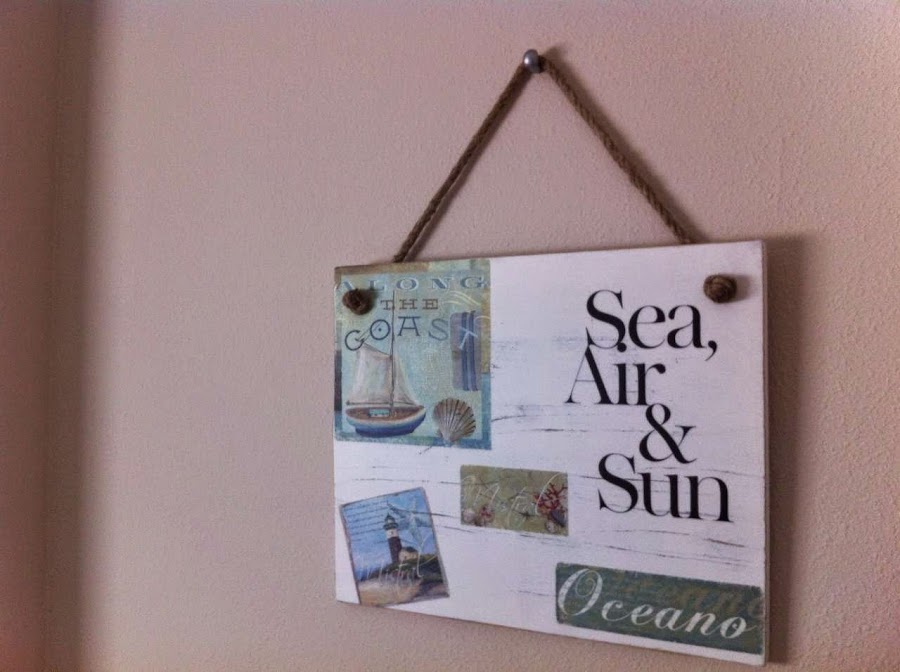 Una vez pintado y transferidas las letras, hice el decoupage y apliqué barniz mate. Un par de agujeros con la broca, lo suficientemente grandes para que pase la cuerda de cáñamo para colgarlo, y listo.
