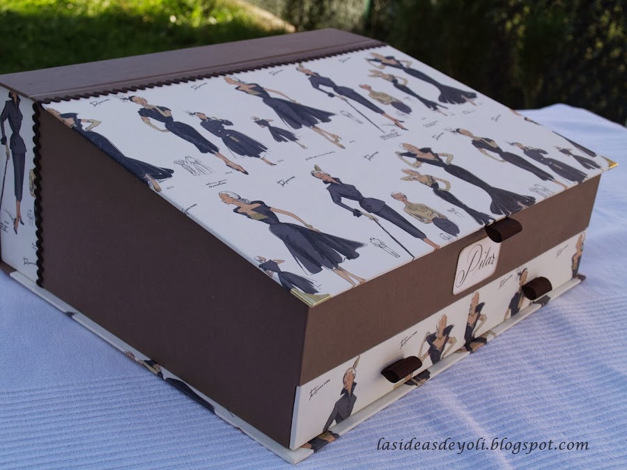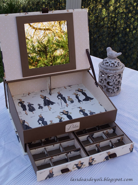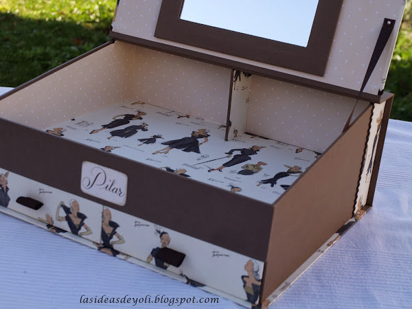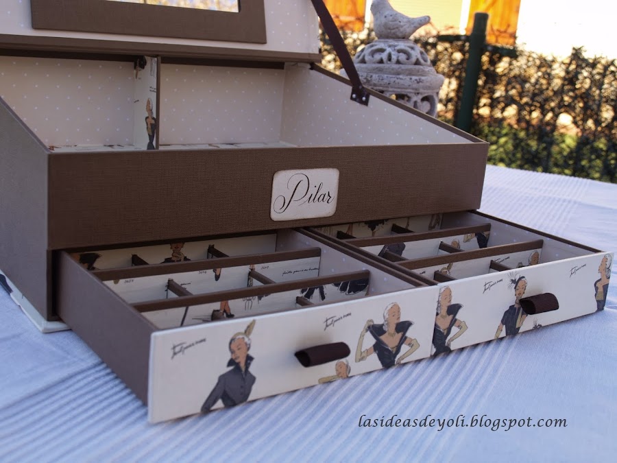 La combinación del color chocolate junto con este papel vintage tan bonito y femenino es la combinación ideal. Un poco de ondulina para delimitar las partes y en su tapa interior un pequeño espejo donde poderse mirar mientras se los coloca.
