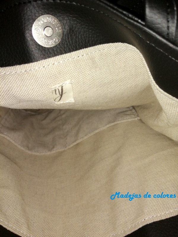 El interior con loneta color natural, doble bolsillo para móvil y llaves, como cierre imán ( también fue su elección) y mi etiqueta.