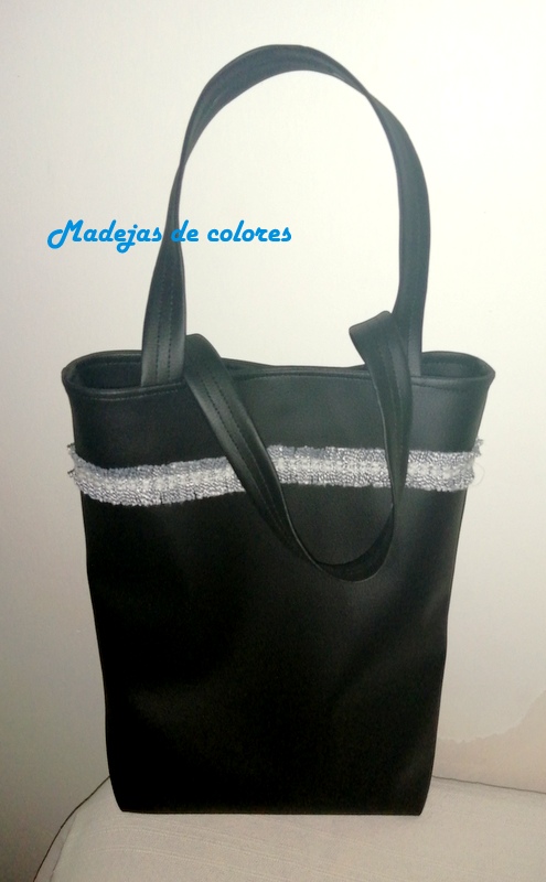 Como con la juventud no te la puedes jugar con sus gustos, opté por preguntarle, para ir sobre seguro y como es de gustos sencillos, escogió un modelo negro en polipiel, adornado con un galón jaspeado en blanco y negro, de forma rectangular y asas bajo el hombro.
