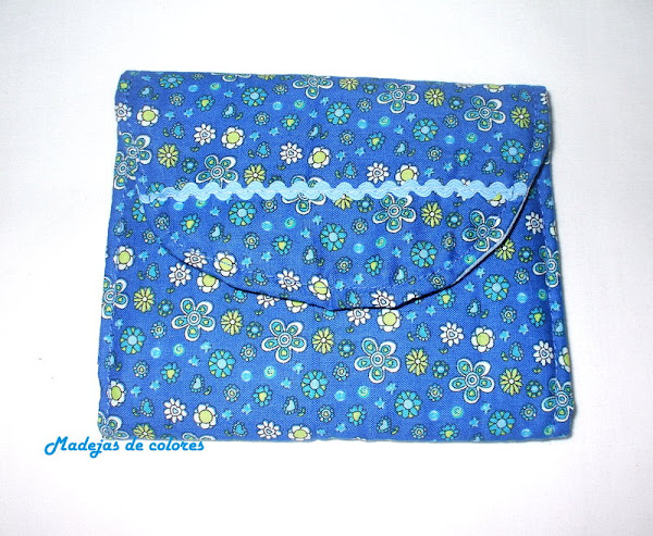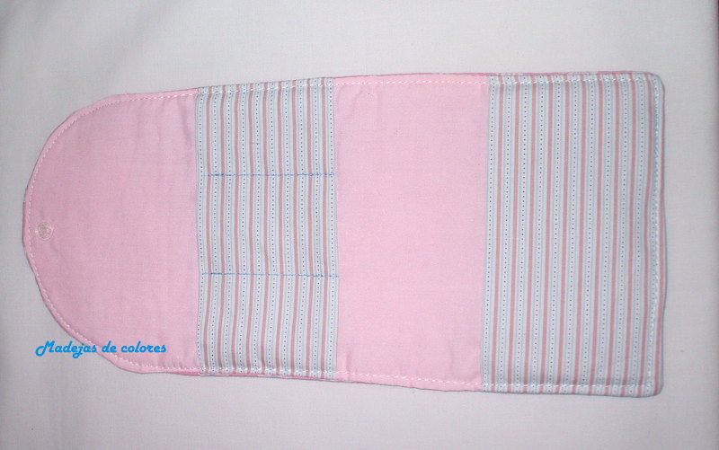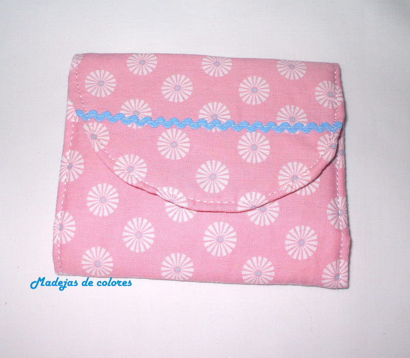 Un estuche íntimo con una delicada tela tilda en rosa y como adorno una piculina celeste a juego con la flor.