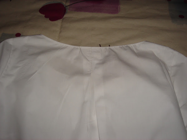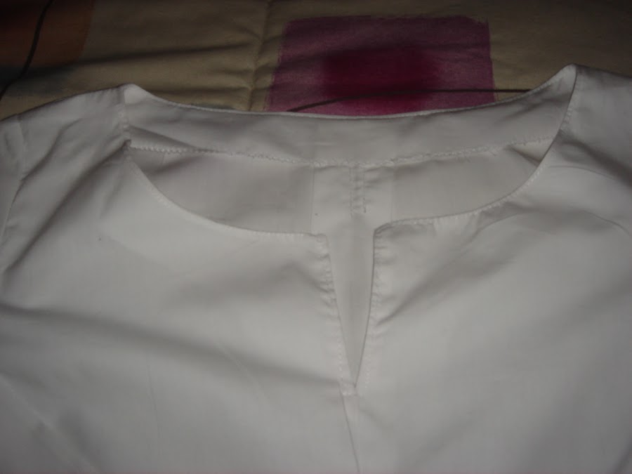 El escote de la blusa es semiredondo pero con una obertura acabada en pico , las vistas del cuello lass he rematado con tela cortada al bies del mismo tejido.
