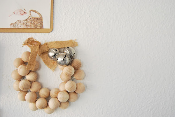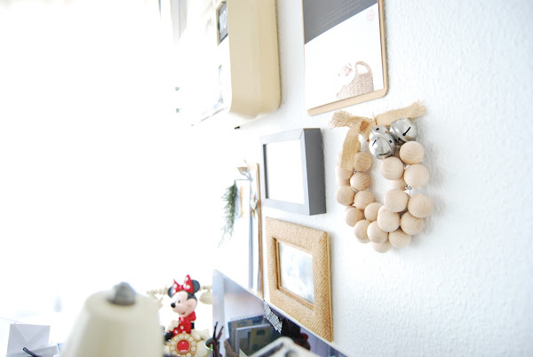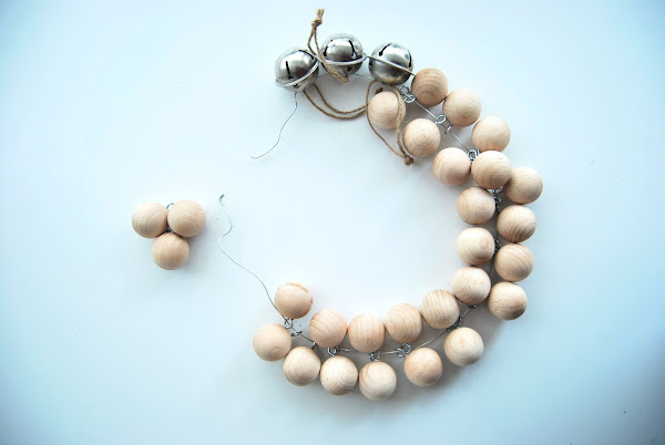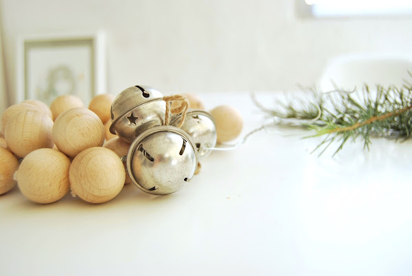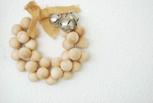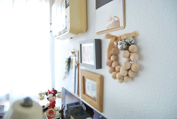 Aunque en esta ocasión quería que la corona fuese muy simple, para romper un poco con el tono madera, coloqué también en el mismo alambre unos cascabeles (los cascabeles siempre, siempre son buena idea) y por último, para esconder el enganche un lazo de tela de saco (arpillera), porque esto de los lazos de las coronas se me da fatal y no quería complicarme mucho con algo más aparatoso. Y porque en realidad seguíamos queriendo una corona muy, muy simple.