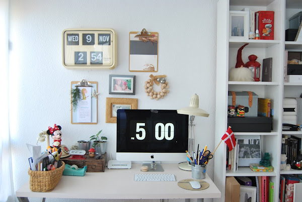 Y no hay más truco, os dejo fotos del resultado. Por ahora la he colocado en la pared encima de mi escritorio (y sí, el reloj de pared no concuerda con el ordenador, necesito pilas nuevas... pero sigue siendo taaaan bonito) junto al calendario de Tutticonfetti, mi lámpara Fase, el teléfono que de Minnie que compramos en el primer mercado de Motores y algunas fotos que me gustan mucho.