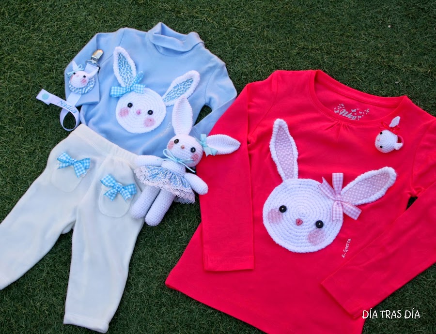 Por ese motivo, para que ella se sintiese también importante, decidí hacerle otro conjunto con conejitos para que las dos puedan ir bien conjuntadas y guapas.
