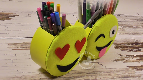 Ya sólo nos queda ponerle las caritas que más nos guste, recortando las piezas con fieltro de otros colores y pegándoselas al portalápiz.