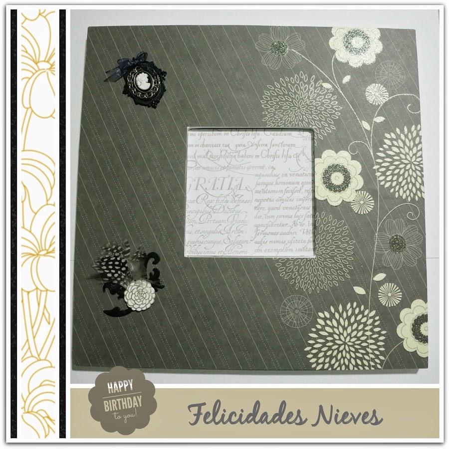 Cómo podéis ver no le puse muchos adornos, solo un par de detalles. Tanto el marco del camafeo como el arabesco son de madera, tintados en negro y con acabado embossing caliente.
