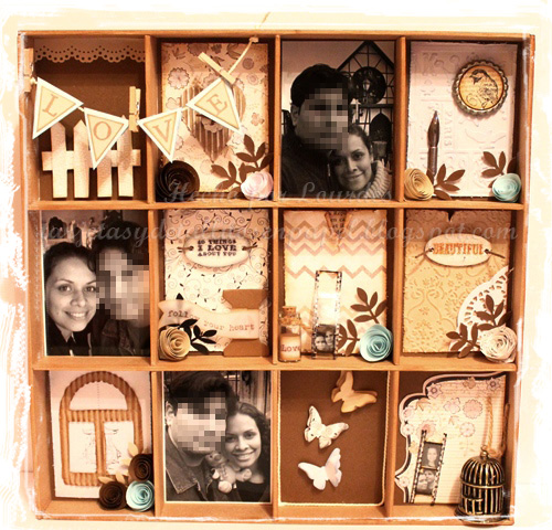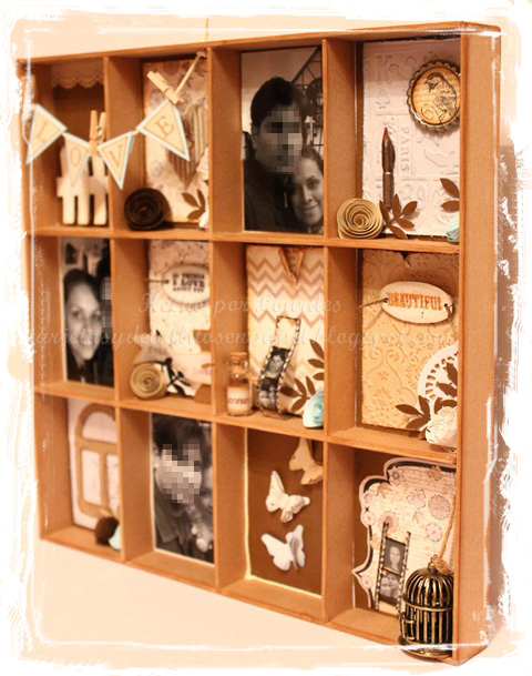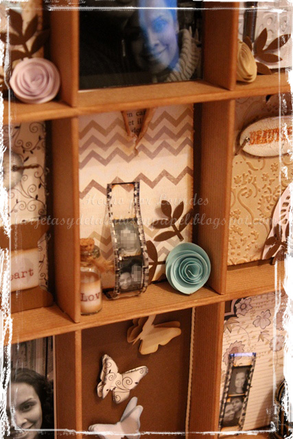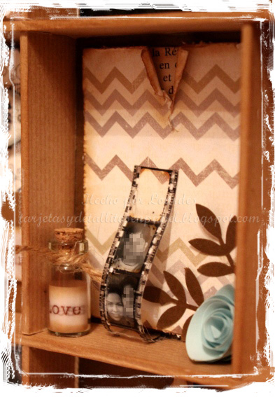 Una cinta de fotografía de Tim Holtz que tenía mucho tiempo guardada y supe que tendría que usarla para este proyecto, por lo que he usado Photoshop y he puesto pequeñas fotos nuestras. A la izquierda, un pequeño vial de vidrio cuyo contenido es una cinta con palabras que nos describen