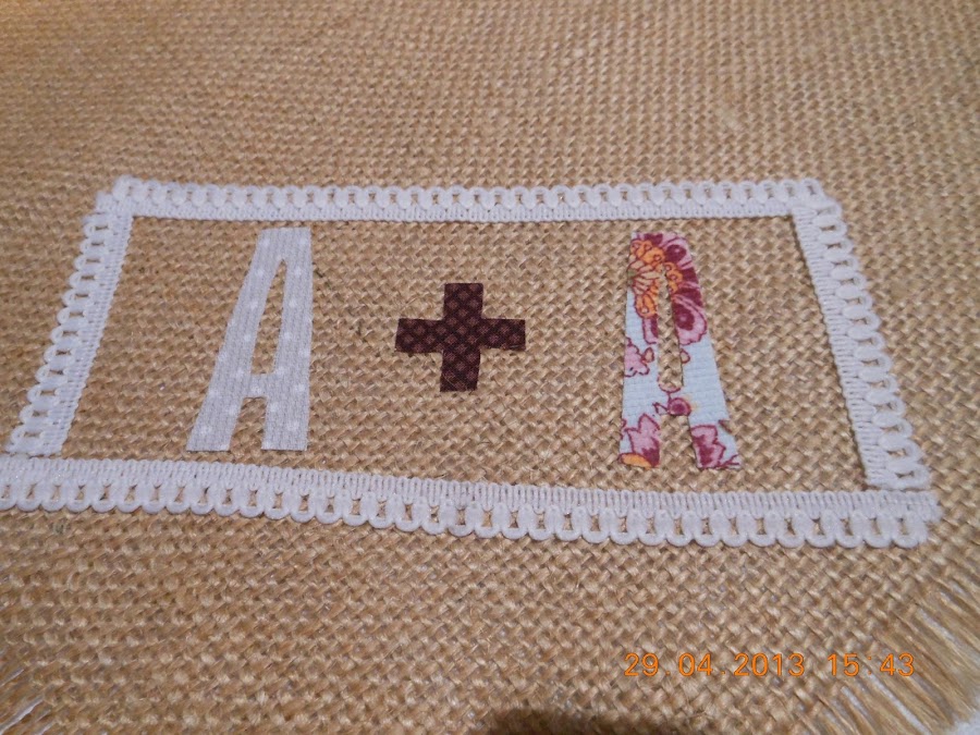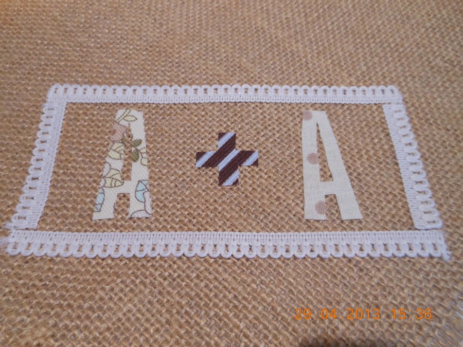 Las aplicaciones son en tela, sobre Viledón adhesivo por las 2 caras y alrededor enmarcadas con una pequeña puntilla
