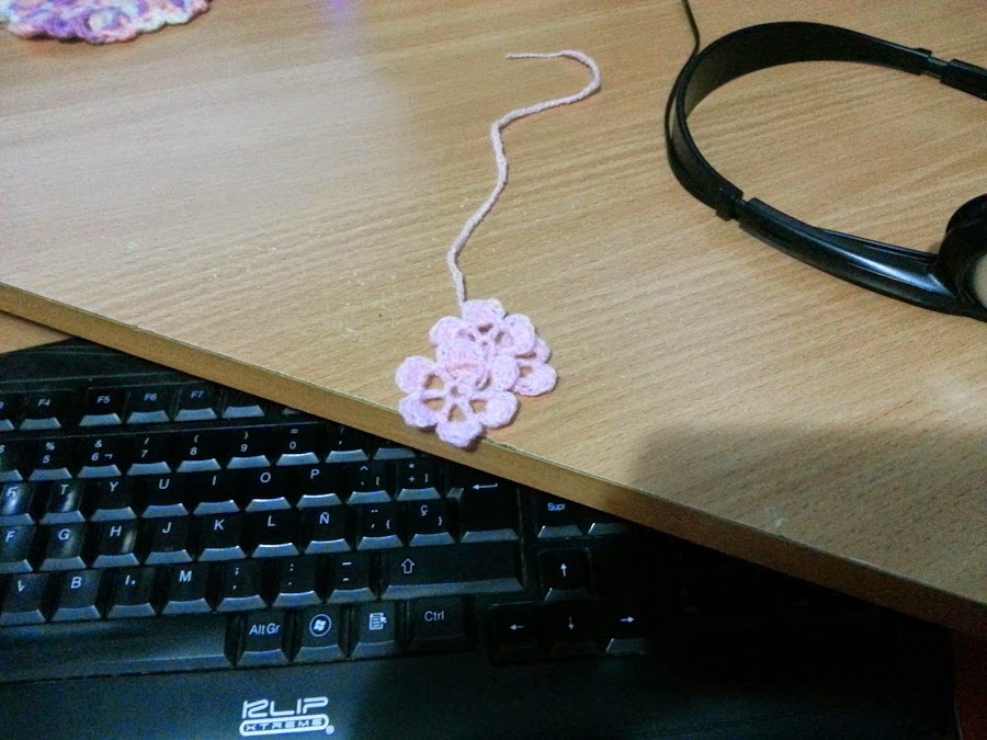 El patrón es simple: se hace una flor de 6 pétalos y al terminarla se hace inmediatamente otra cadeneta que forme otro centro de flor pero se hacen solo 4 pétalos. Al terminar esta se hace otra cadeneta de centro de flor y solo lleva dos pétalos.