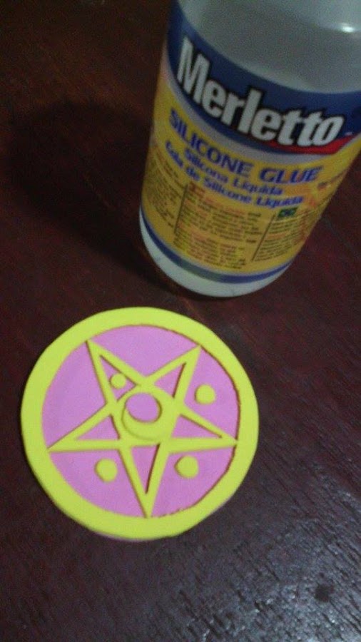 Paso 4 : Pegas las piezas con silicon frío en el foami rosa y corta cuatro círculos pequeños en amarillo y pegalos en el orden de la imagen.