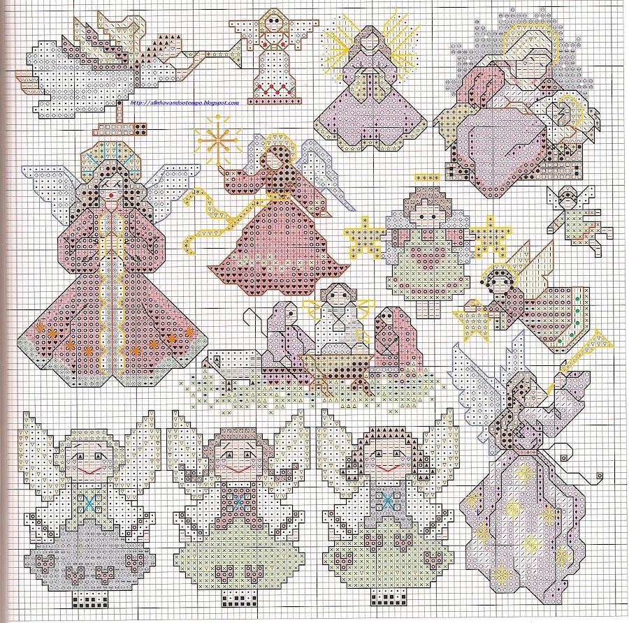 Patrones de ángeles.Sí. Será por ángeles? por eso, os pongo éstos, si los queréis de lado, tenéis, si queréis en un portal de Belén, también, de frente y sonrientes, tocando la trompeta... que ya no tenéis excusa para bordar un angelico navideño. A ver si me animo yo también y os pongo en unos días los resultados.