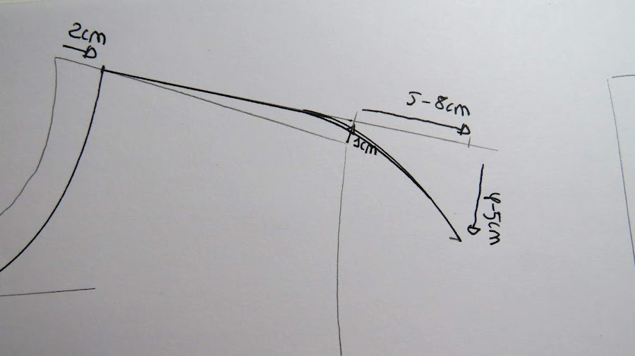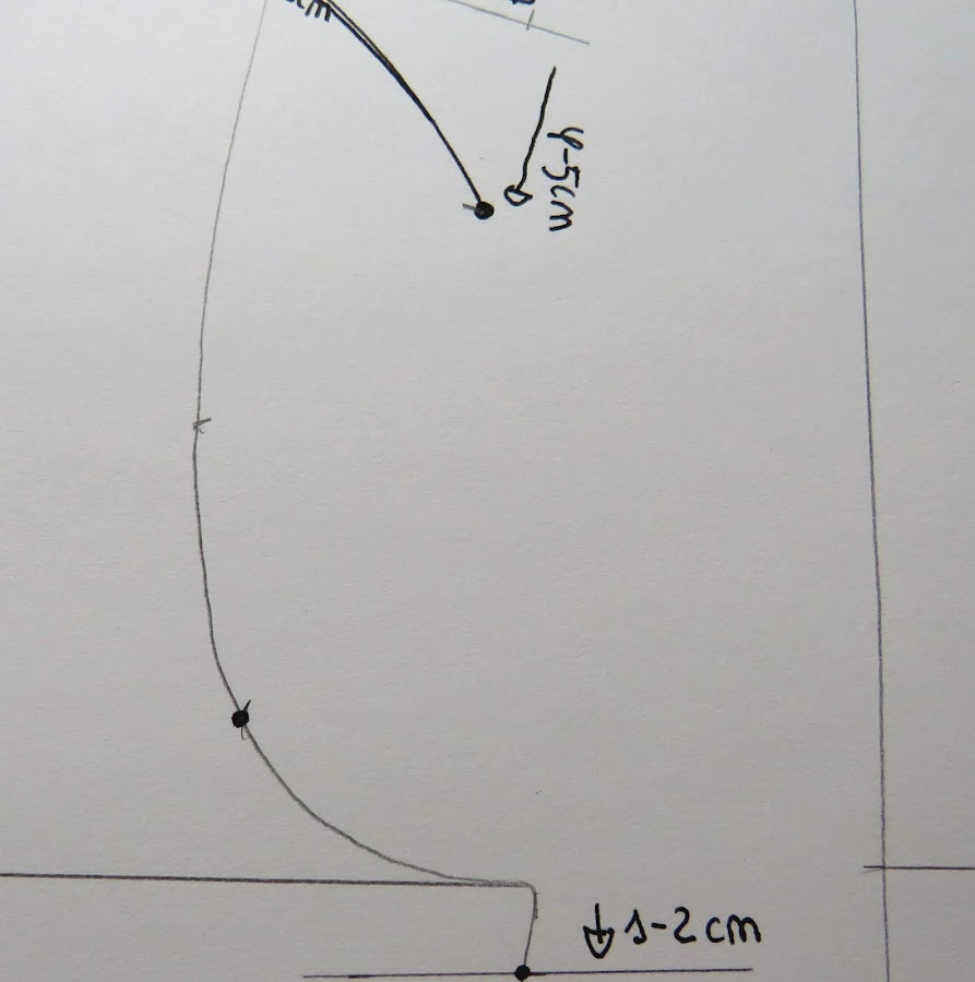 Marcamos estos 3 puntos, que serán por donde pase el dibujo de nuestra manga. El primer punto está donde bajamos los 4-5 cm, el segundo sería nuestro punto 3 del patrón base y el tercero, donde bajamos 1-2 cm