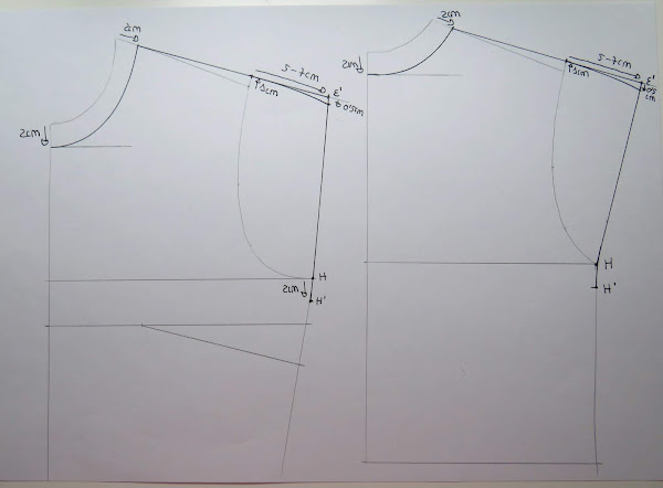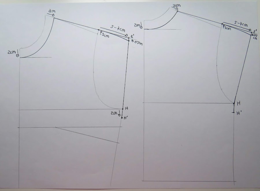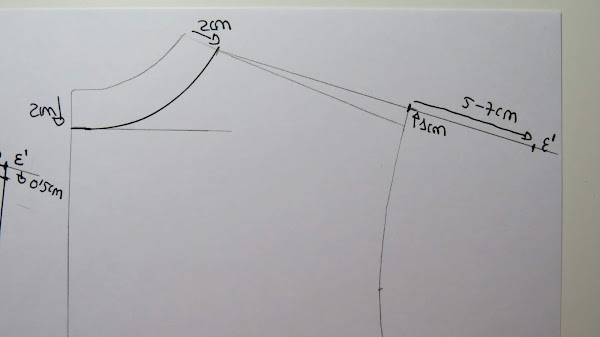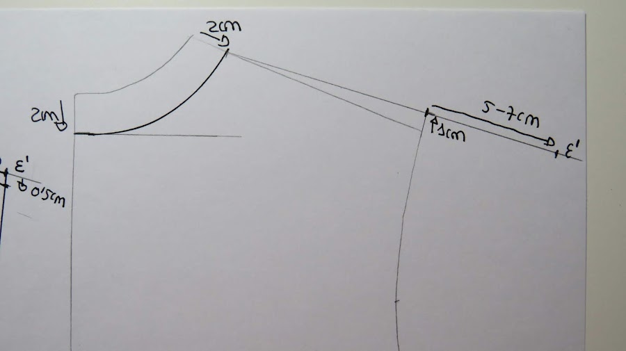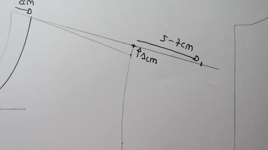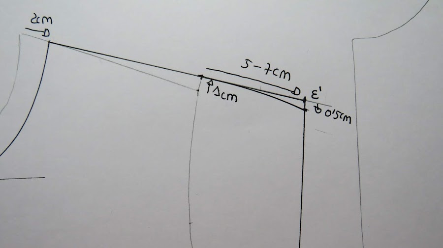 Además, elevaremos 1 cm en el extremo del hombro y trazamos una línea recta indefinida, que salga de la base de escote nueva.