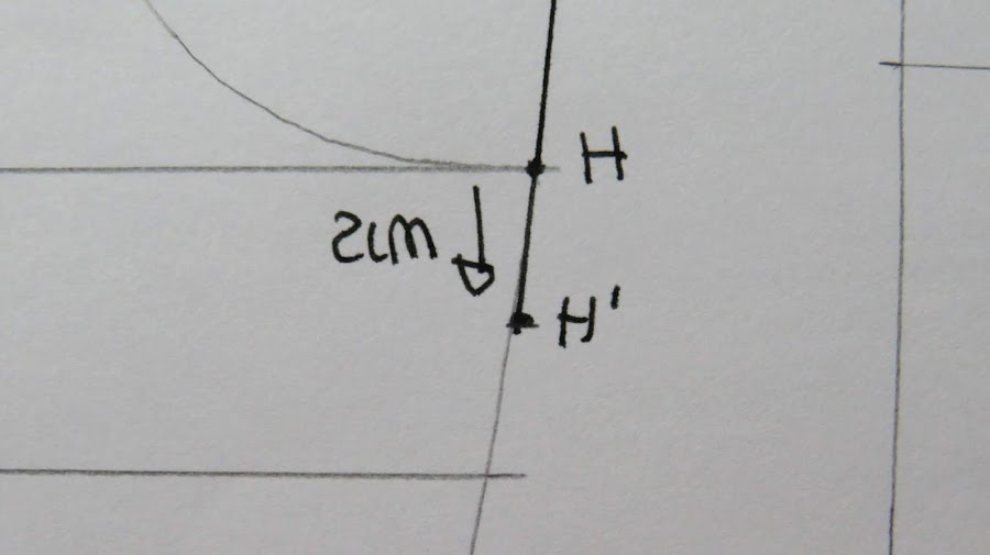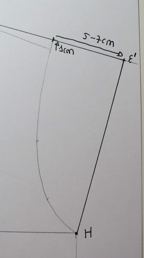 Desde H, bajamos 2 cm. y marcamos H. Esta H nos marcará hasta donde llegará la abertura de la manga, ya que al ir recta, tenemos que señalar el punto donde empezará la costura de costado, y los 2 cm los hemos bajado porque, al ser una manga un poco más cerrada, necesitamos dar un poco más de abertura para poder movernos cómodamente. Podemos darle un poco más, pero nunca menos.