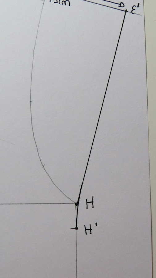En este caso, al unir con línea recta E con H, la línea de la manga nos queda más inclinada, esto es porque, si recuerdas del patrón base, la medida del pecho delantero tiene algunos cms. más que en la espalda, por eso esta diferencia. Si fuera una manga japonesa, haríamos el patrón más igualado para que nos quede igual, pero en este caso, al ir la prenda entallada igualmente, no lo he hecho así, aunque no pasa nada si hacemos la medida de pecho igual en delantero y espalda, para que te quede igual.