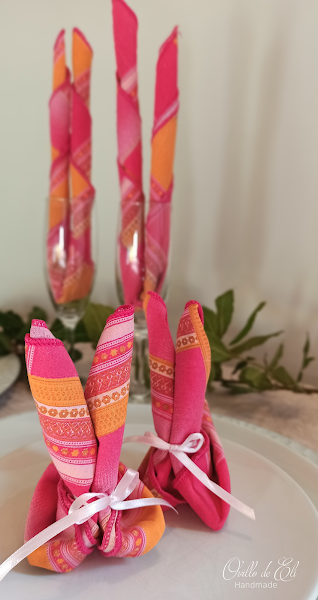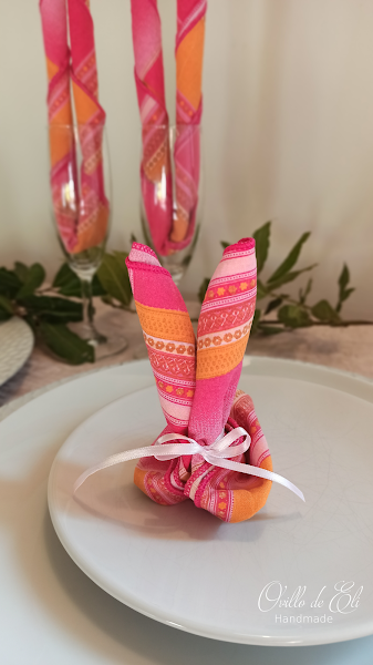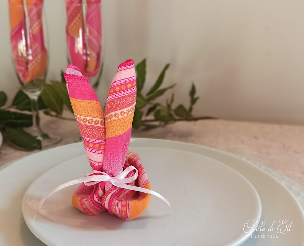 He seguido el tutorial Cómo doblar una servilleta con forma de conejo, de 501 Cosas, así de sencillo encontré el tutorial , en el video se muestran los dobleces con servilletas lisas, en realidad no sabia como se presentaría el resultado con servilletas estampadas, pero me gusto mucho más porque es casi como el decorado de los huevos