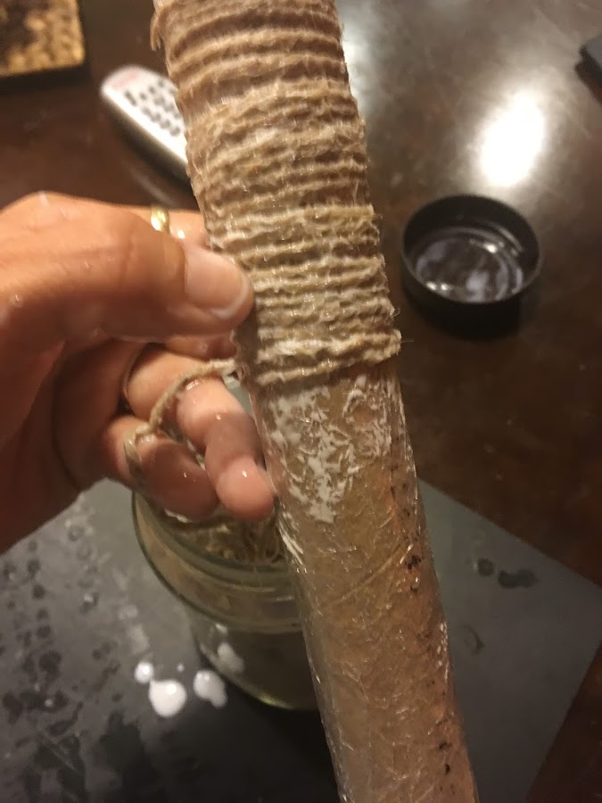 Tomamos la punta del hilo empapado comenzamos a enroscarlo en el tubo de cartón. Dejamos secar unas 24 hs aprox.