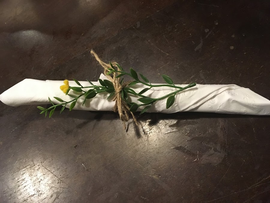 Enrosca una servilleta de papal o tela, e introducela por el aro de hilo rustico. Por ultimo colocalo en el plato ...