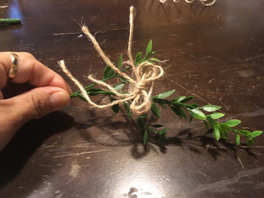 En el medio de estas tiras colocar una ramito de hojas y terminarlo haciendo un moño.
