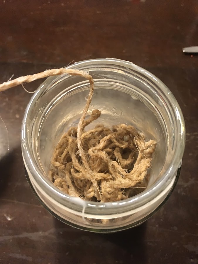 En el frasco mezclar la cola vinilica con el agua, agregarle el hilo rustico, este tiene que mojarse bien.
