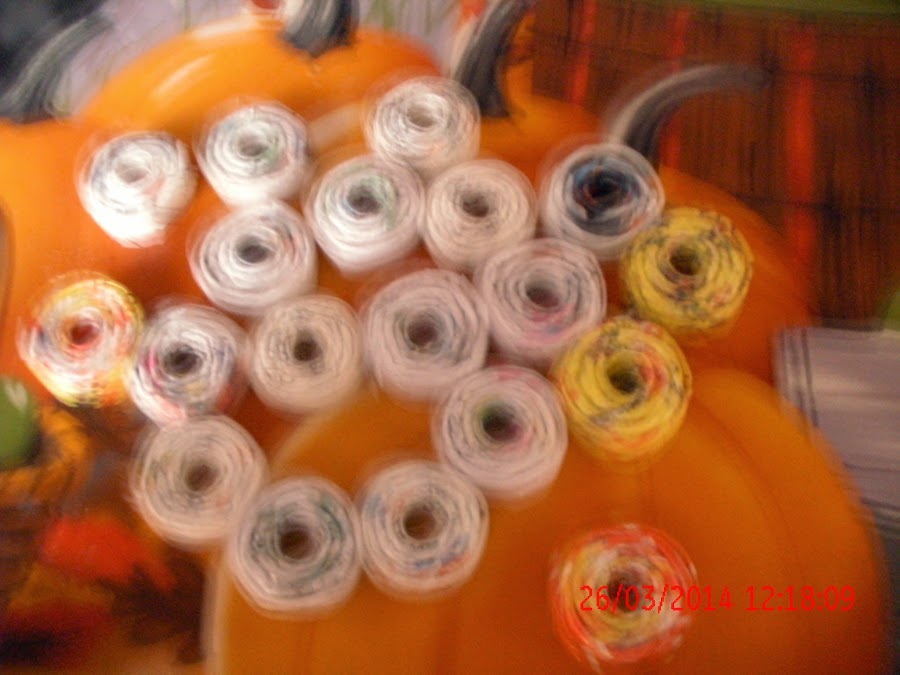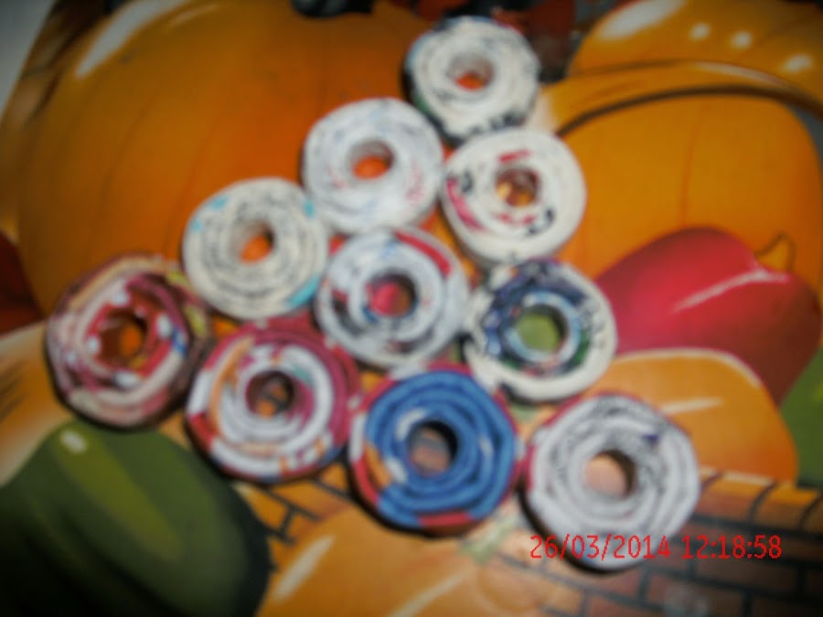 HECHO ESTO CON TODOS, LOS ENROLLAMOS EN UN LAPIS O EN UN TUBO, CAÑO, ETC, PARA DARLE FORMA CIRCULAR, A MEDIDA QUE LO ENROLLAMOS LO VAMOS PEGANDO, PAPEL CON PAPEL.