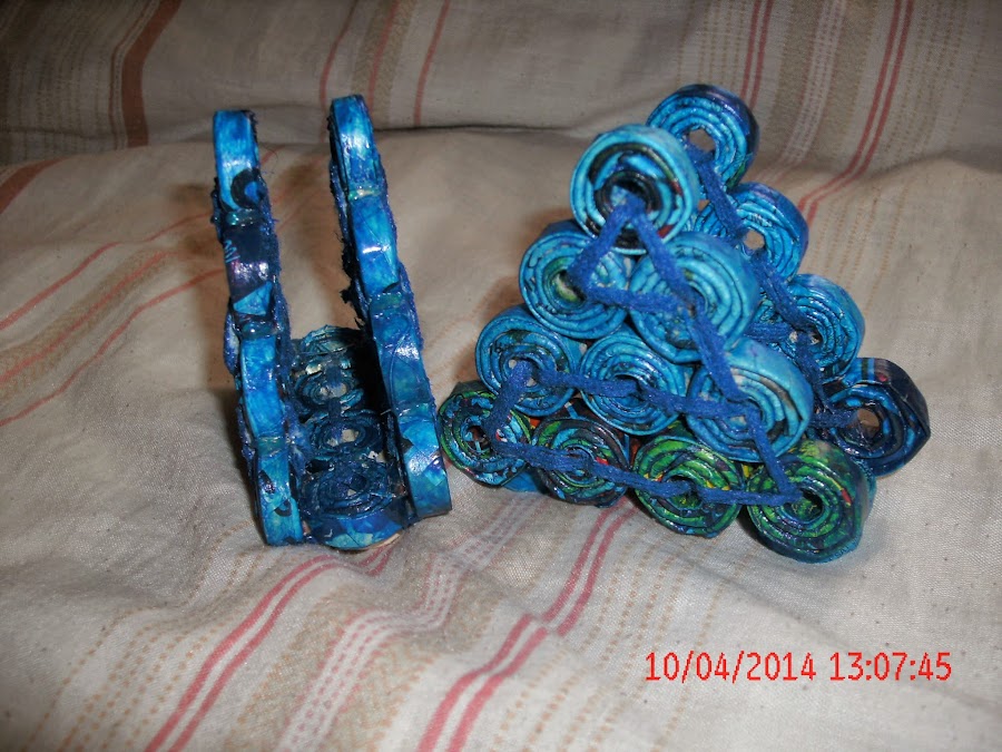 SI NOS GUSTA LO PODEMOS DEJAR ASI Y PARA PROTEJERLOS LE DAMOS UNA MANO DE BARNIZ, ME OLVIDABA QUE EN LA BASE LE PUSE 2 CIRCULOS MAS PARA LEVANTARLOS UN POCO, O SEA LOS PEGUE DEBAJO DE LOS 4 CIRCULOS DE BASE, UNO EN CADA PUNTA, Y PARA ASEGURARLOS MEJOR LE PASE UN TROZO DE LANA POR LOS AGUJEROS CENTRALES, LUEGO LOS PINTE, EN MI CASO EN COLOR AZUL, QUE ES LO QUE TENIA.