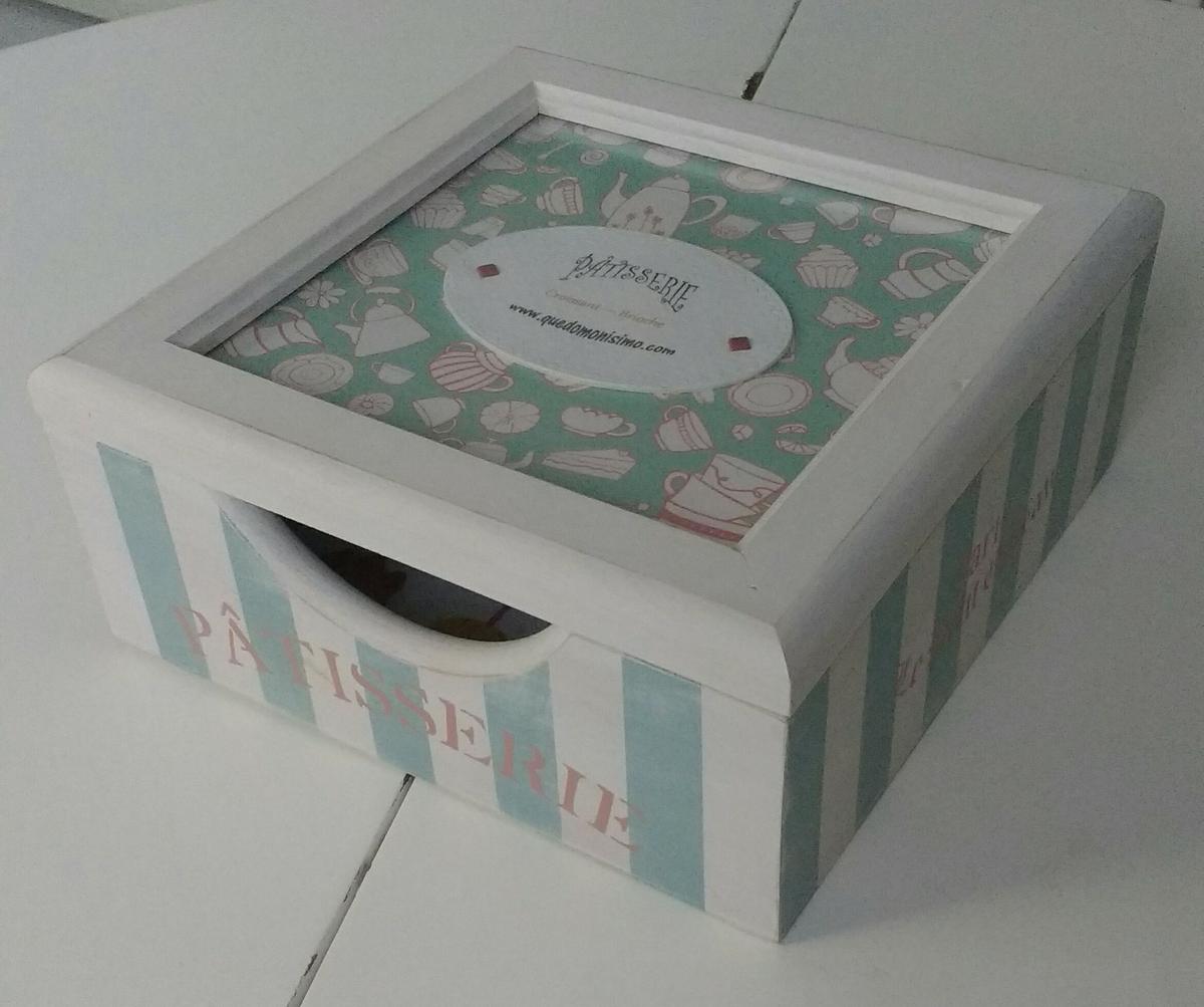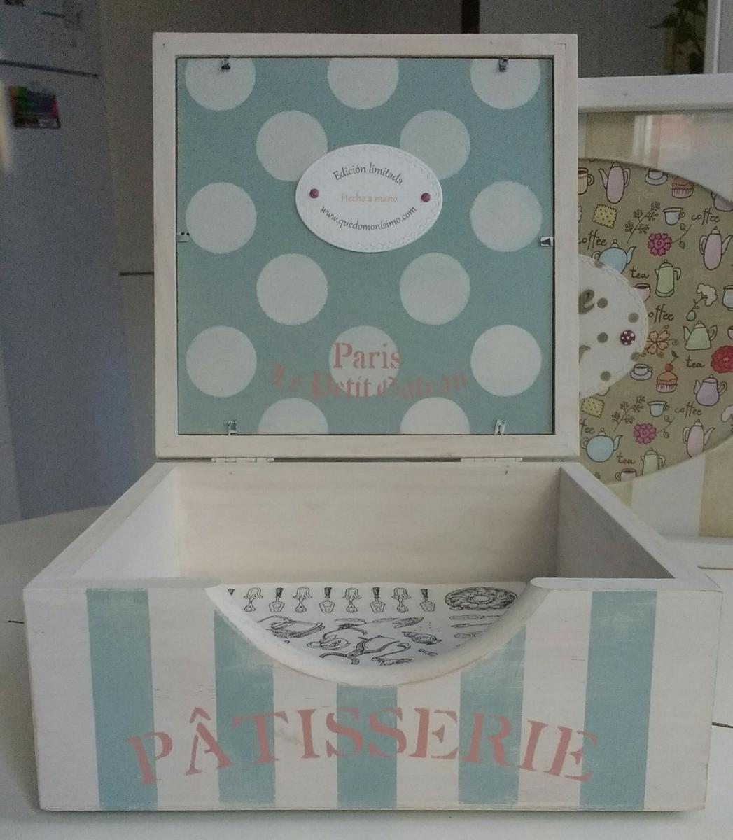 Cajas de madera de pino que suelen utilizarse para guardar servilletas. Están decoradas con pintura de acabado tiza, que últimamente me ha dado por ahí, hasta hace poco utilizaba pintura acrílica, pero es verdad que el terminado mate de este tipo de pintura queda muy bien y permite hace efectos muy majos cuando se lija.