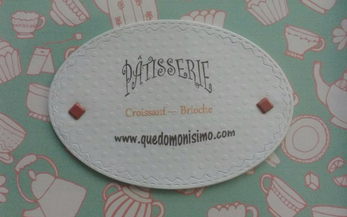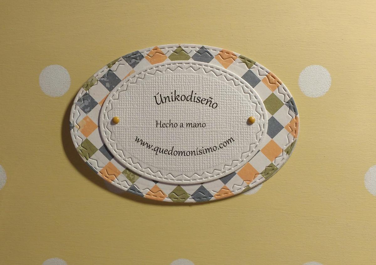 La etiqueta está hecha con un troquel de Szzxi y unas tachas. Para darles un poco de grosor, pego varias cartulinas, hasta lograr 1,5 o 2 mm.