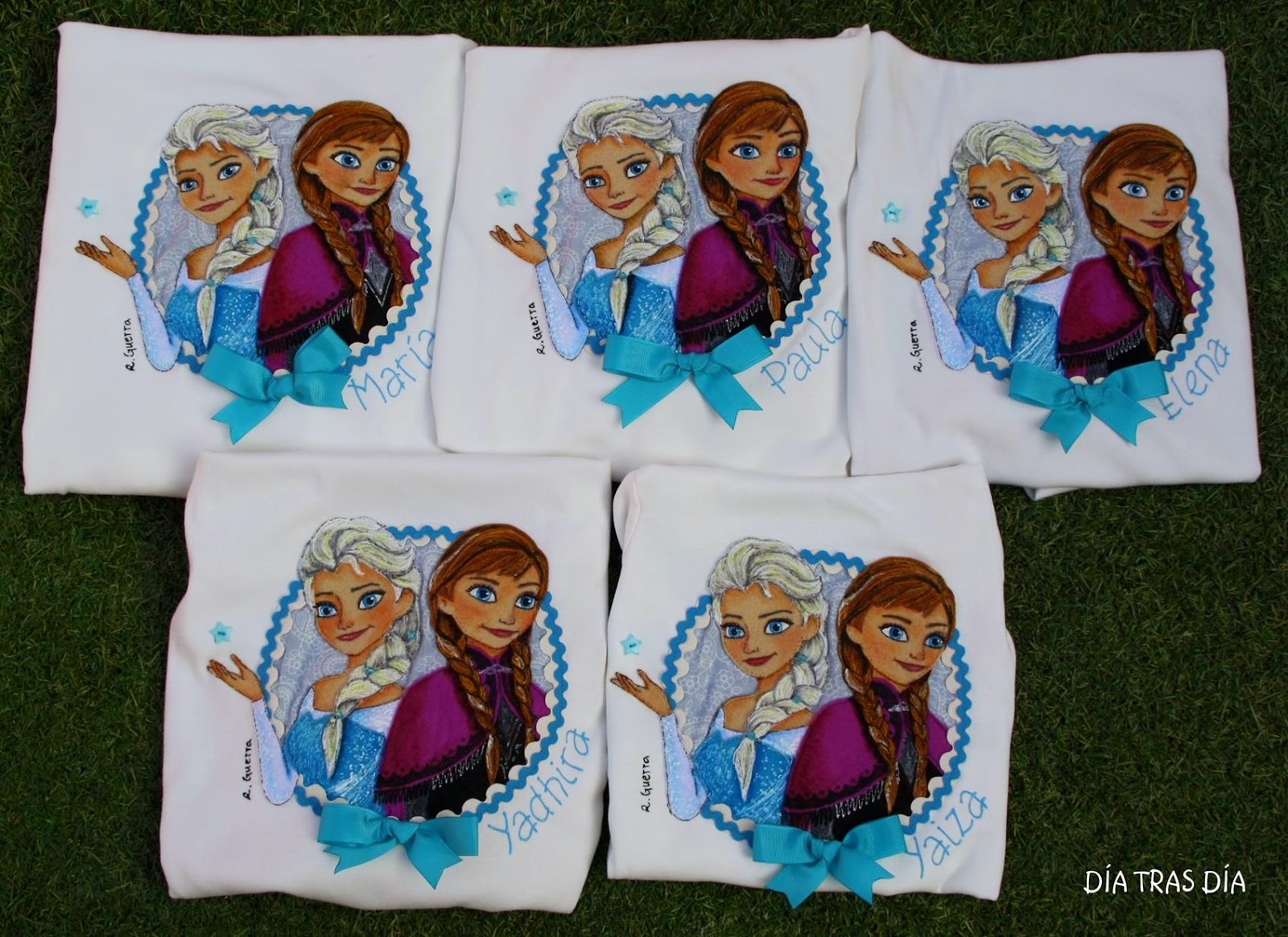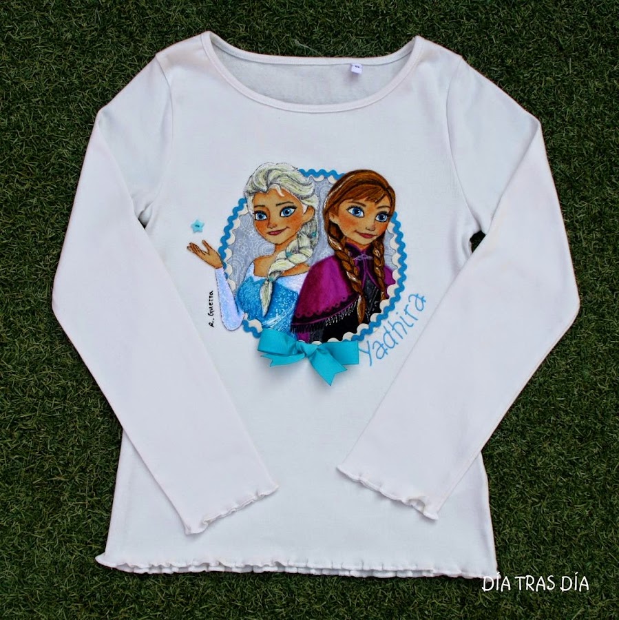 Hace algunas semanas se puso en contacto conmigo Lupe para pedirme unas camisetas con las protagonistas de Frozen. Se ve que se debieron poner varias mamás de acuerdo para hacer un pedido conjunto de camisetas con el mismo dibujo, así que fueron en total 5 camisetas, en tallas diversas, con Elsa y Anna como protagonistas.