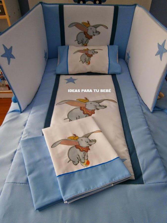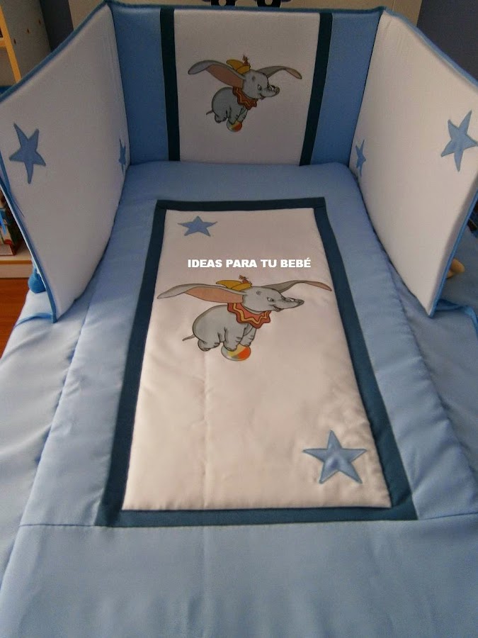 Por encargo de Berta se confeccionó un set de cuna en colores azules y blanco con el diseño de Dumbo volando. El edredón y protector se ha decorado con estrellas celestes a juego. El set incluye las sábanas con el mismo diseño y colores. Berta espero te guste tu pedido.