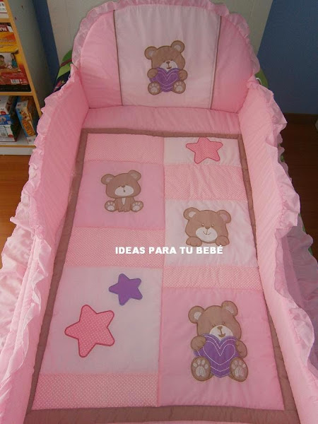 Edredón y protector de cuna con diseño de unos preciosos ositos bordados en diferentes posiciones. El edredón está decorado también con pequeñas estrellas de colores. En tonos rosa, beige y blanco que dan un toque suave a la decoración.
