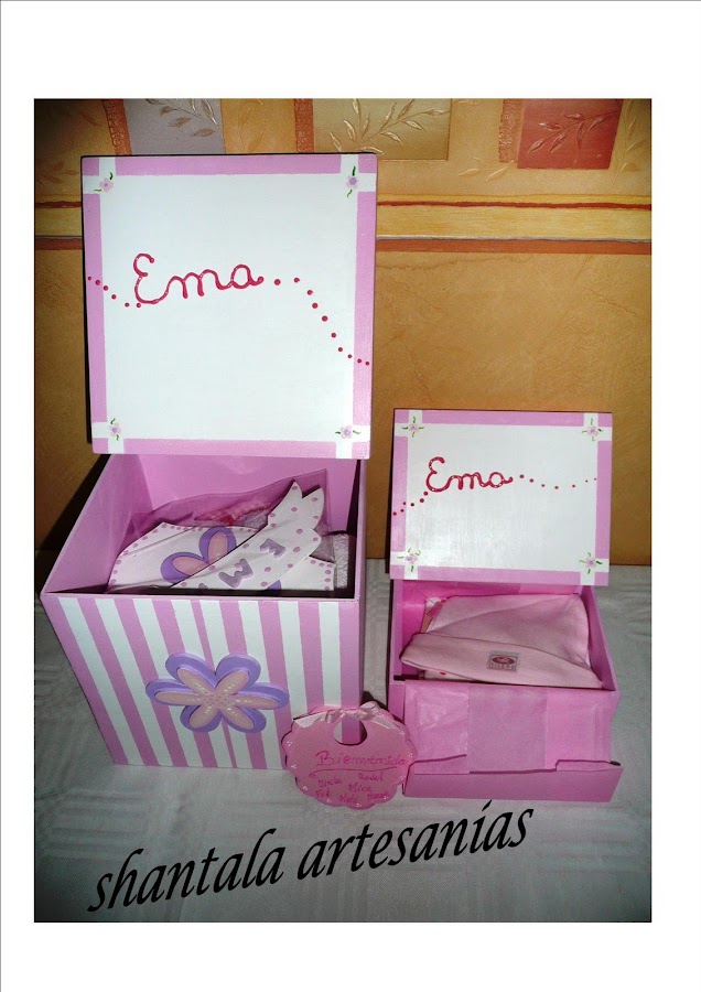 Tiene 2 cajas, las 2 pintadas con acrílicos, la mas grande lleva un aplique de una flor y el nombre está puesto con pintura dimensional