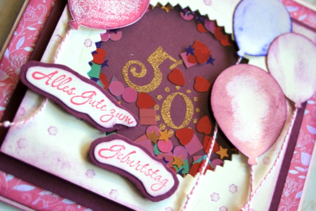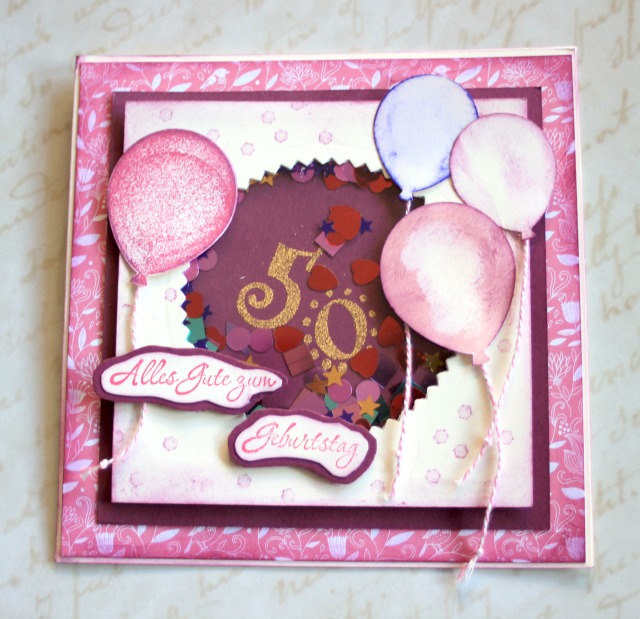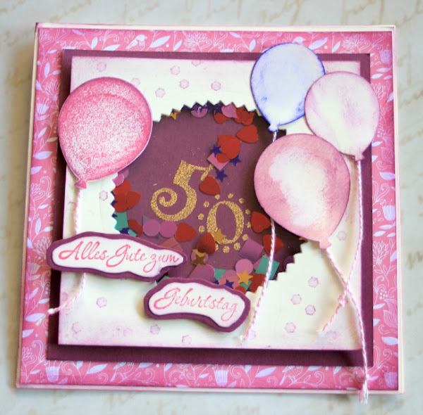 Una tarjeta especial, para una amiga en sus 50 cumpleaños. Se me antojó hacerle una "shaker card" (algo así como tarjeta para agitar?) con globos porque en su invitación también usaba globos. Me llevó horas encontrar un pedazo de lámina transparente en mi scraproom, ya estaba tirando la toalla cuando apareció! uff! manos a la obra