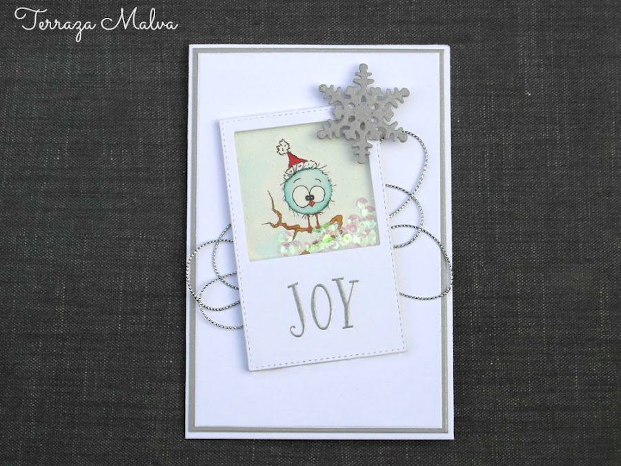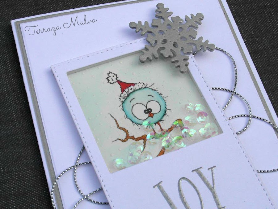 En esta tarjeta tipo shaker he utilizado uno de los sellos digitales navideños de Karin de Kajsans Scrapblog, coloreado con Kuretake Zig Clean Color. En el fondo he usado Enamel Accents blanco para simular que está nevando. Aunque los copos son pequeños y en la foto no se aprecian bien, ha quedado un fondo precioso.