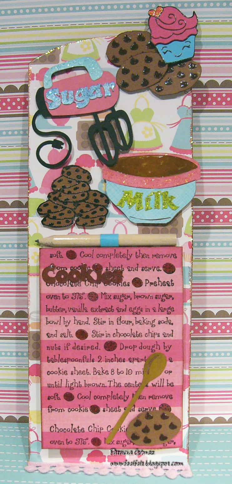 El sello de la receta de cookies es de Hero Arts, y se llama CHOCOLATE CHIP COOKIES Recipe.Está embosado, y las cookies coloreadas con rotu, y toque de glossy.
