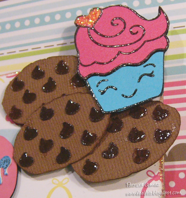 Las cookies recortadas con la craft, llevan unos deliciosos chips de chocolate (recubiertos con glossy).El cupcake es un sello de Hero Arts, del set Kiss the cook.