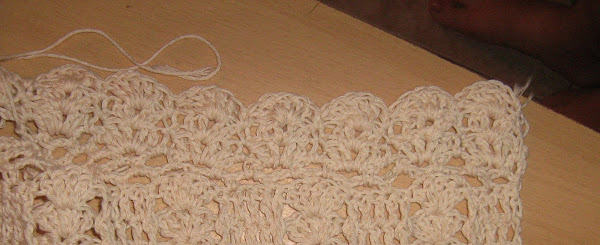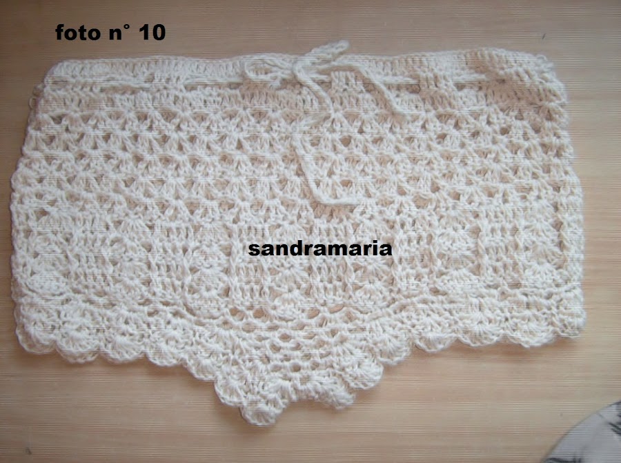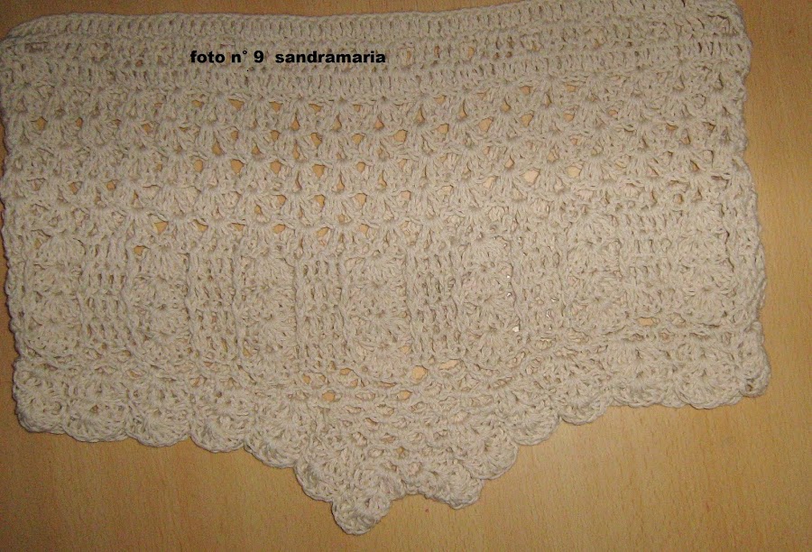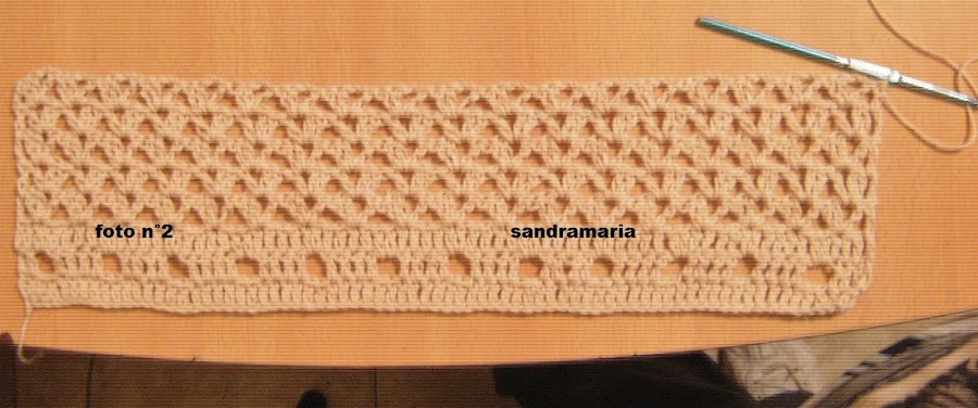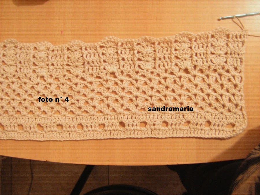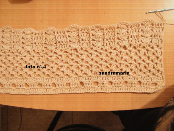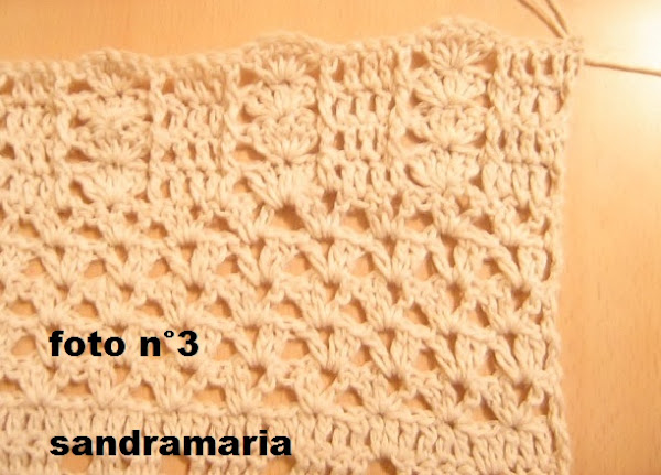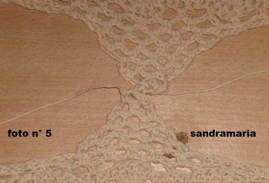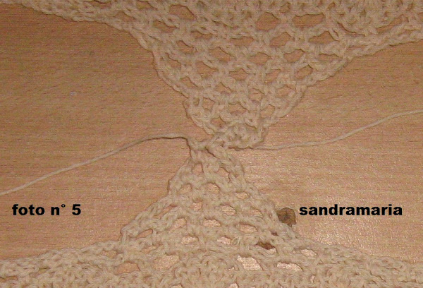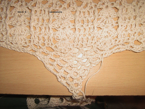 CENTRAMOS EL MISMO Y TEJEMOS UN TRIANGULO DE 6 ARCOS DE 3 CADENAS Y VAMOS DISMINUYENDO EN CADA VUELTA 1 A CADA LADO HASTA QUE NOS QUEDE 1 ARCO SOLO...