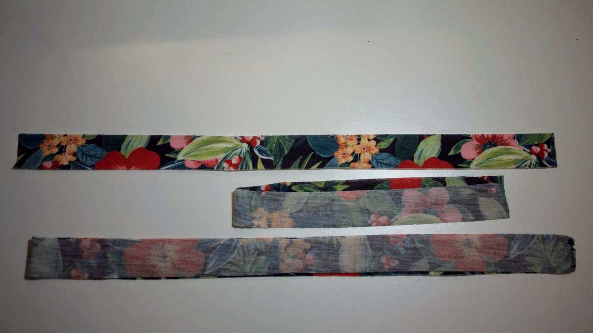 Para coser el top enfrentaremos el delantero y el trasero para pasar una costura por los hombros y por los laterales. Cómo mi tela es elástica he usado una puntada en zig zag en todas las costuras.Las dos piezas del top enfrentadas antes de coserlas Para finalizar las mangas y el cuello en lugar de hacer un dobladillo, he cortado varias tiras de tela para colocar a modo de bies. En la imagen veis dos tiras para las mangas y una tira para el cuello, para coserlas al top lo pimero que he hecho ha sido coser los extremos para que formaran un círculo.