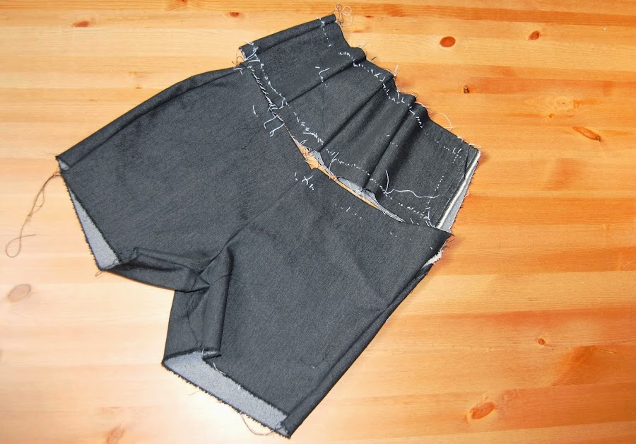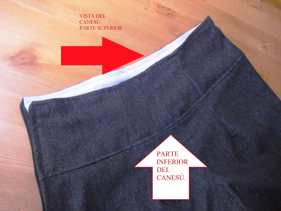 Ahora vamos a unir el canesú al pantalón. Debemos tener mucho cuiddo para que las costuras de canesú y pantalón queden alineadas.
