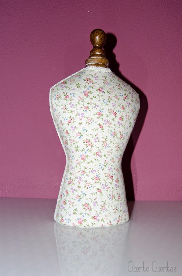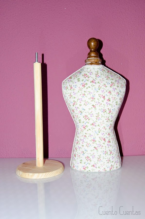 Pero ¿cómo me iba a deshacer de este maniquí tan bonito? Él no tenía la culpa de nada, pobre, así que decidí que tenía que ayudarle a levantarse, que le quedaba mucho por hacer. Le busqué una nueva base y aquí le tenéis, más tieso que nunca, dispuesto a empezar otra vez.