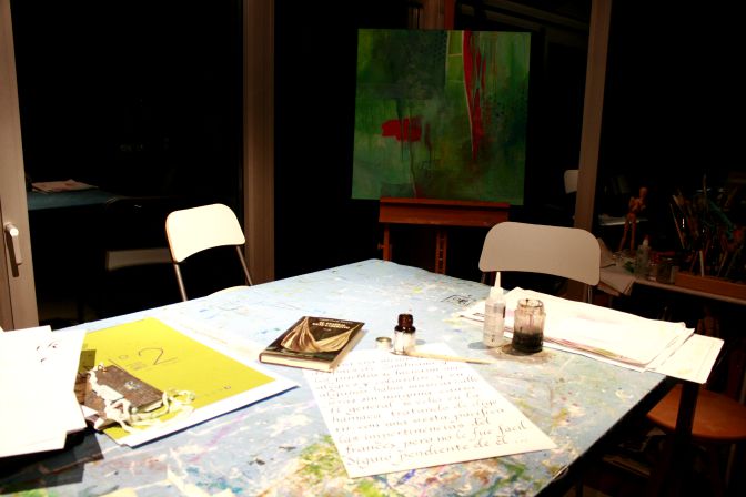 Soy contradictoria, inconstante, olvidadiza, despistada.. tremendos defectos! pero también soy responsable y obstinada, asi que sigo practicando a veces en la noche cuando las temperaturas bajan. Mi taller fué pensado y hecho para ser mi taller, asi que tengo buenas luces, luces que puedo variar y dirigir, en este caso a mi mesa, y cuando estoy en algo las horas pasan sin que las sienta. Noches con la cancilleresca y "El general en su laberinto"!
