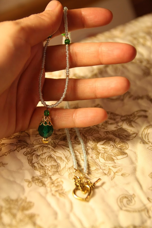 Por el momento, sólo puedo mostraros lo que he realizado con la "minibotellita" de color verde; por raro que parezca, lo que más me ha costado es ensartar todas las diminutas cuentas que forman el cordón del collar...