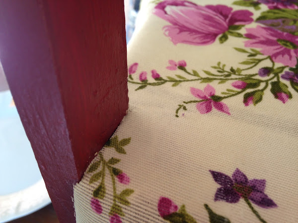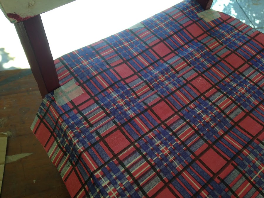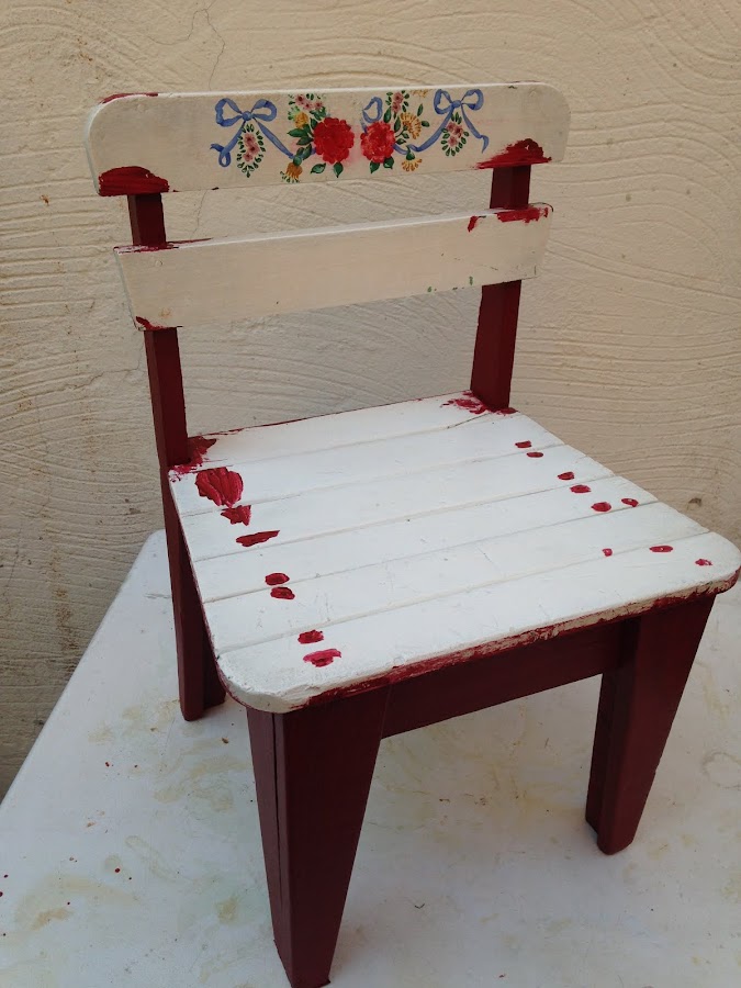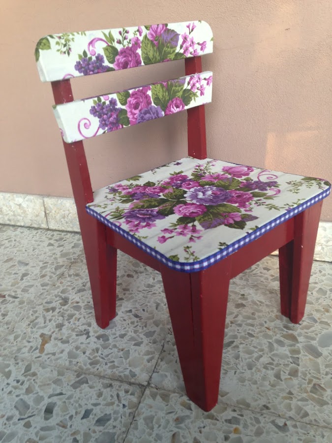 Esta sillita era mía, tiene muchísimos años en la familia. Se nota por la madera que es muy fuerte y ha sido muy bien cuidada, pero estaba necesitando un cambio de pintura. Y siguiendo con mi encanto por el decoupage utilicé telas con un estampado importante. Medí para poder posicionar bien el dibujo, pegue la tela a la madera con cola vinílica y una vez bien seca le di dos manos de barniz al agua para impermeabilizarla.